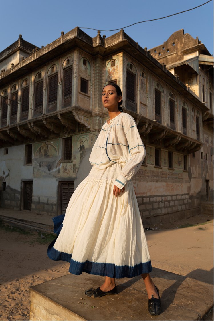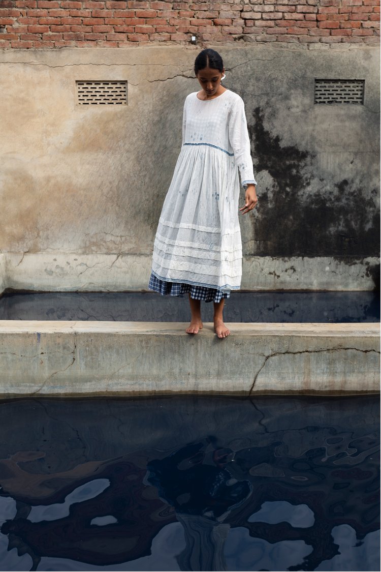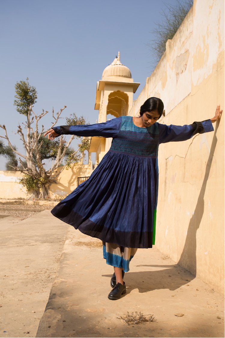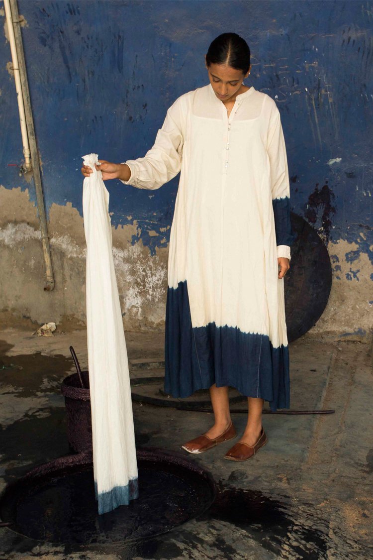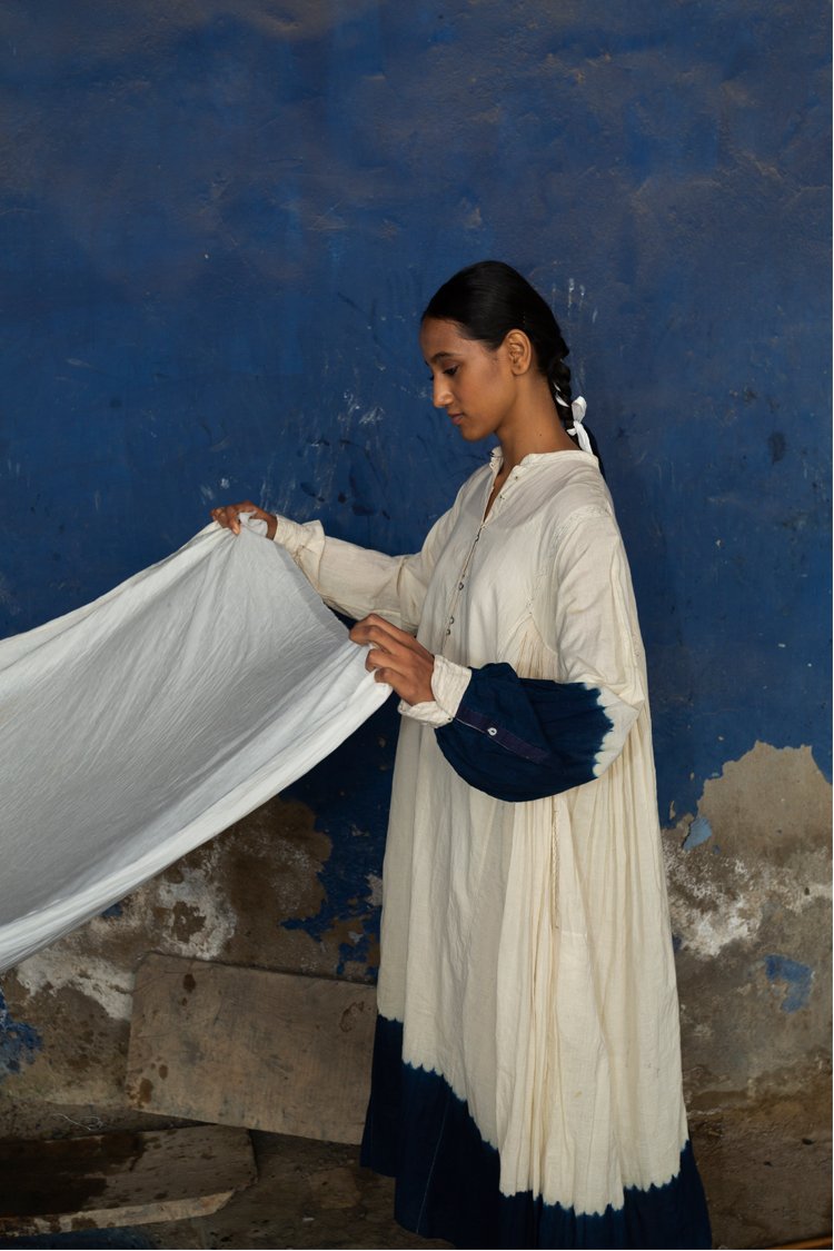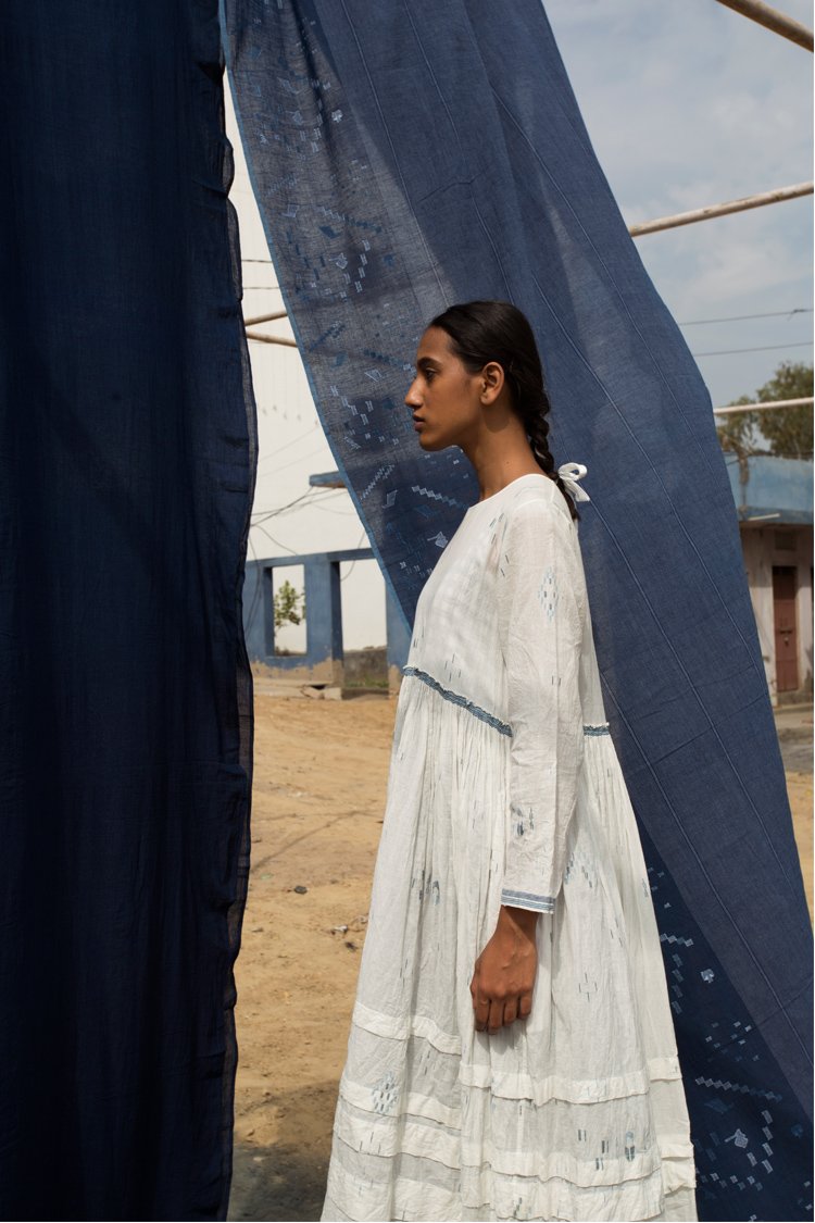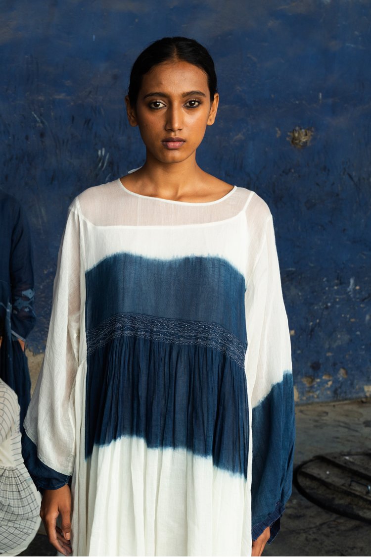 Neel is a collection developed with experiments with natural indigo over the years across various textile techniques such as Jamdani, clamp dye, extra weft. Jamdani is an old technique that Injiri is associated with and it has been done using natural vats for this line. In terms of silhouettes we have been conservative in our approach as to cut a garment in a way that there is minimum wastage.
