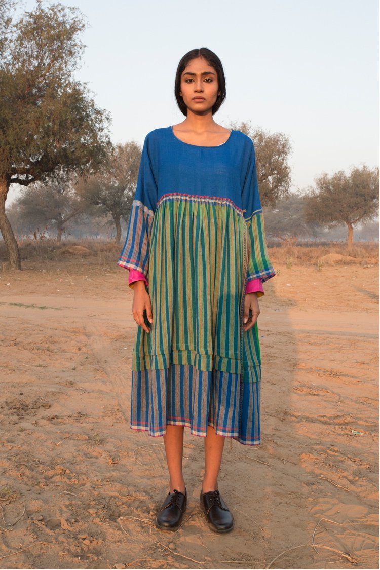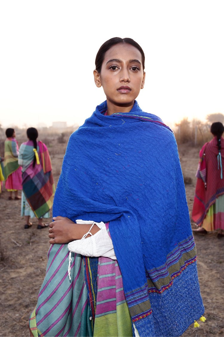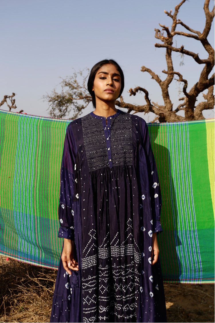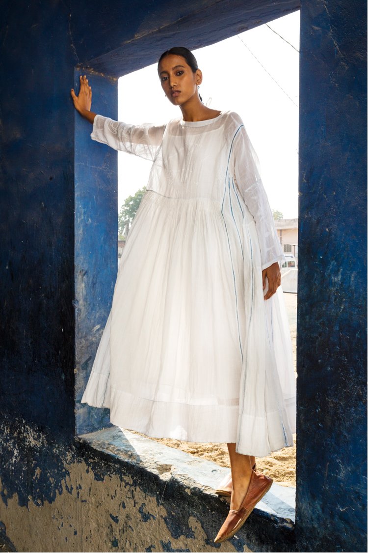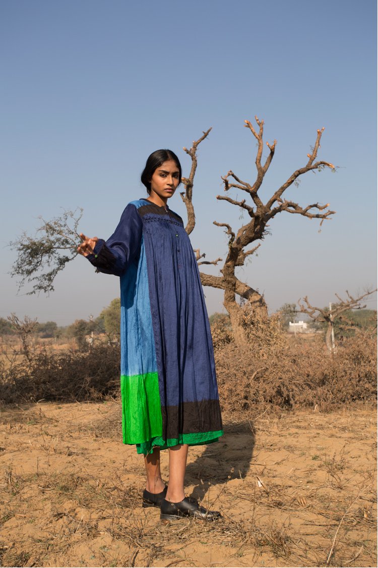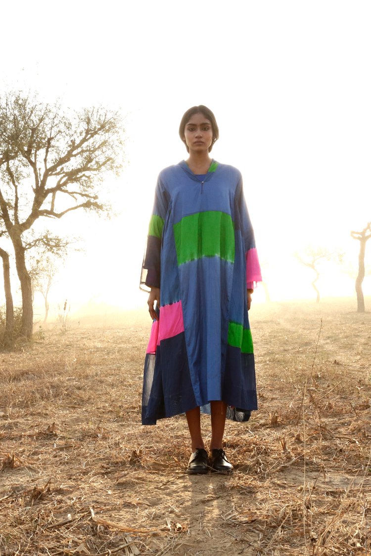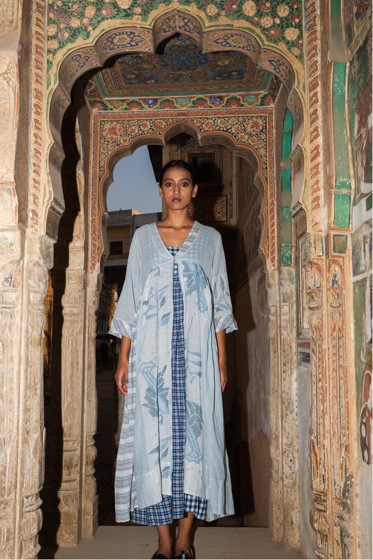Neel is a collection developed with experiments with natural indigo over the years across various textile techniques such as Jamdani, clamp dye, extra weft. Jamdani is an old technique that Injiri is associated with and it has been done using natural vats for this line. In terms of silhouettes we have been conservative in our approach as to cut a garment in a way that there is minimum wastage.