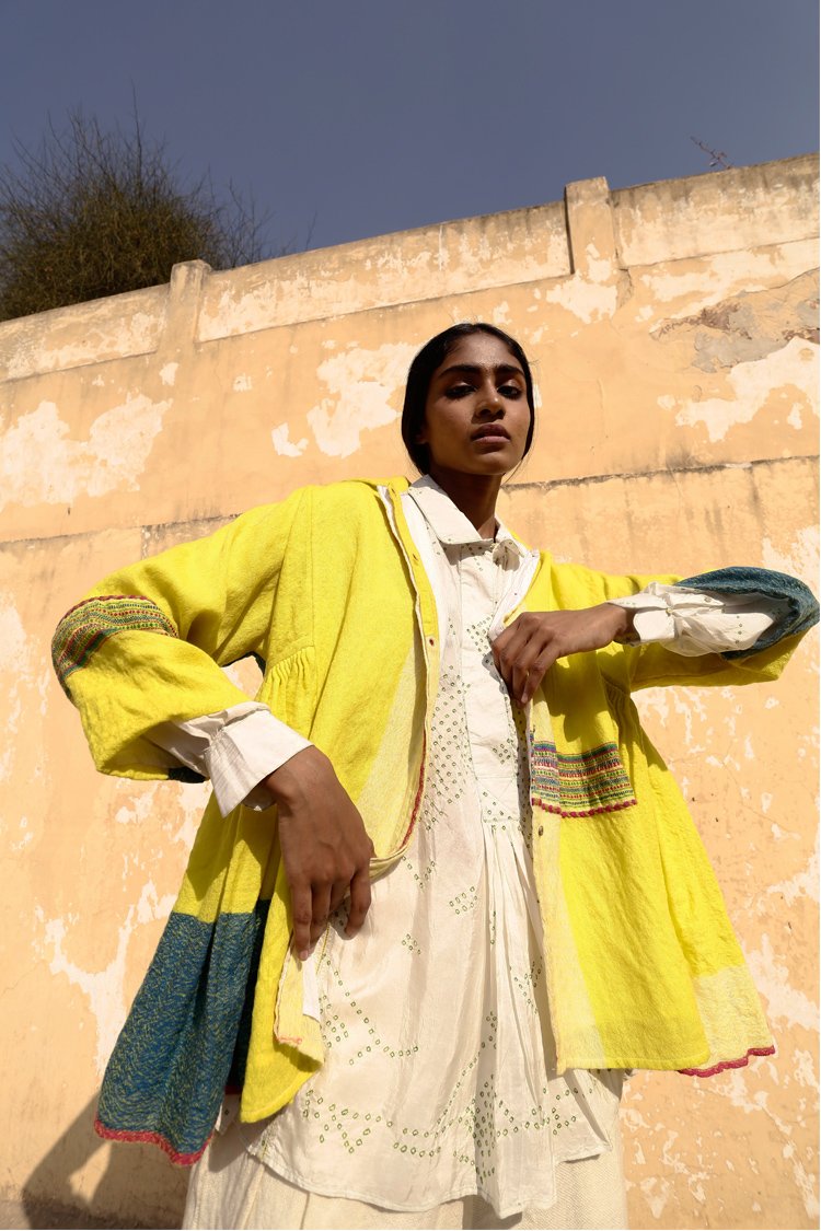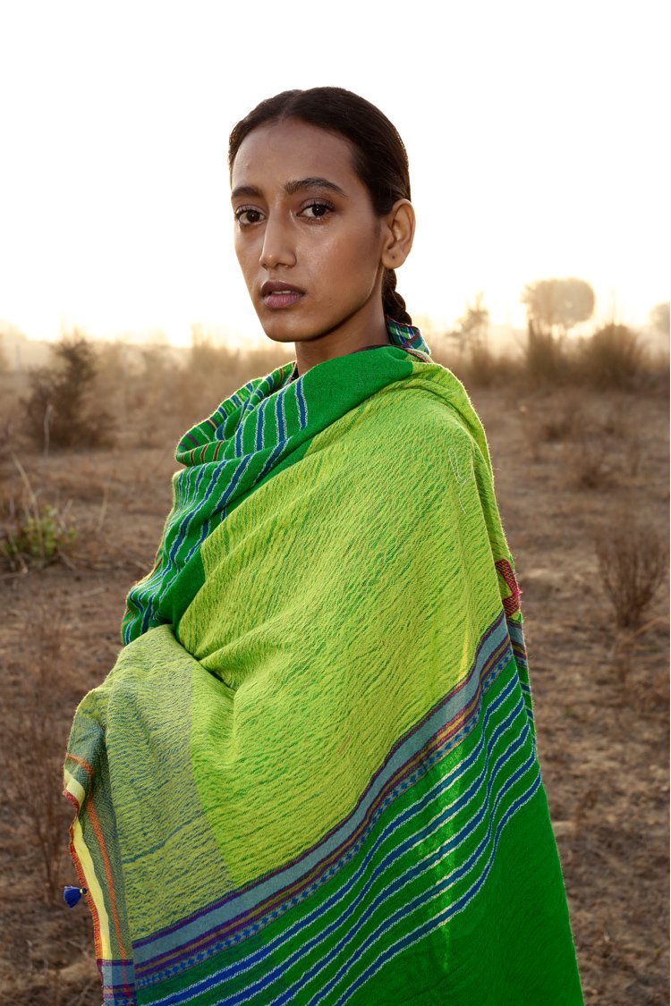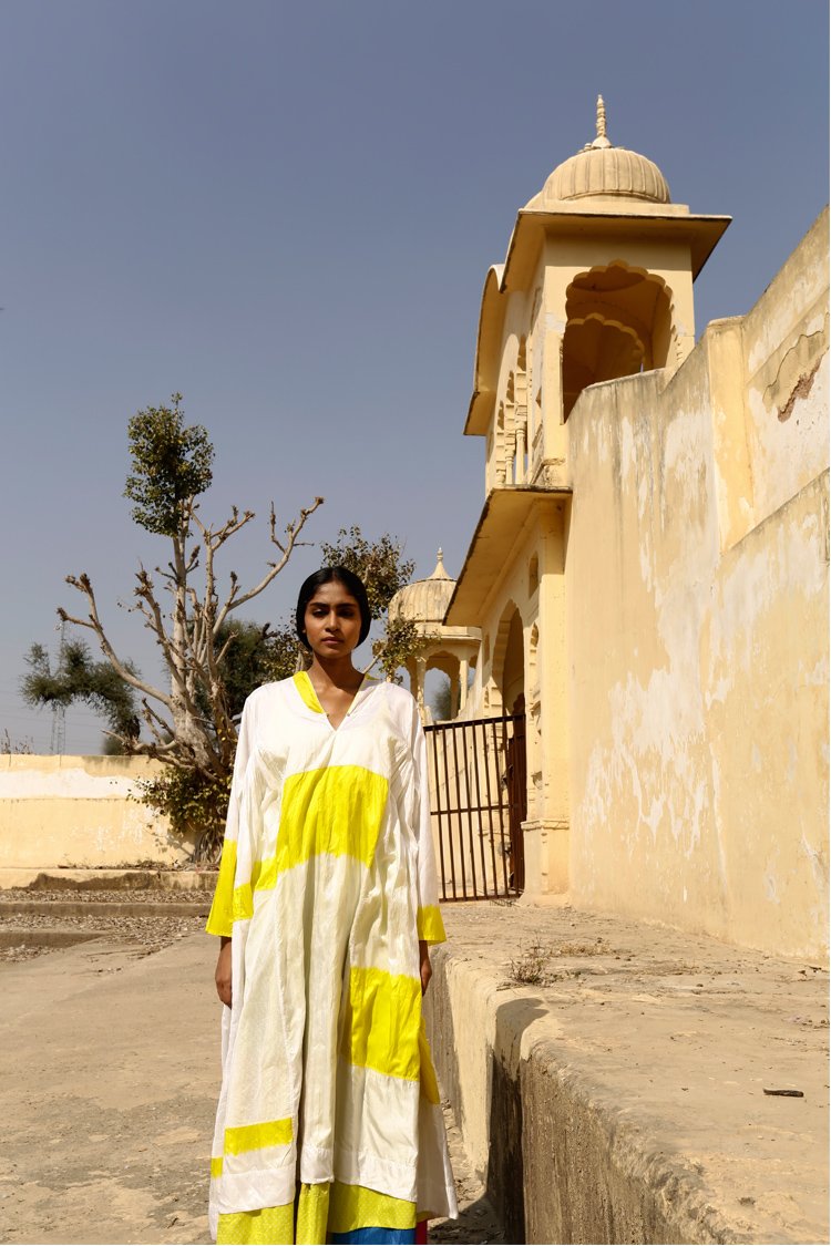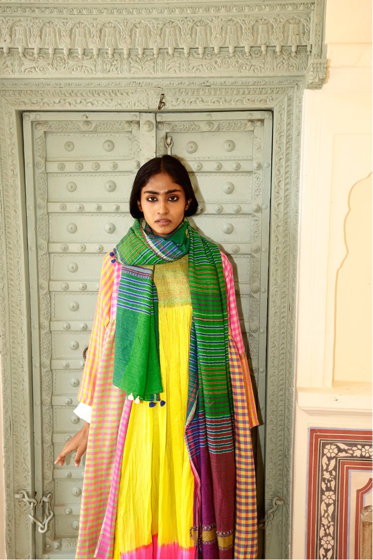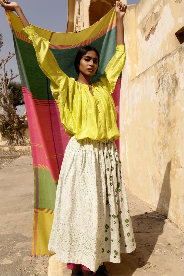 TaanBaan is a celebratory collection embracing Spring and enjoying summer with its gorgeous Greens, Pinks, Yellows, and Whites, created with organic cotton and combining ancient Indian techniques of extra weft from Bhujodi and Jamdani of West Bengal, as well as intensive clamp dying.