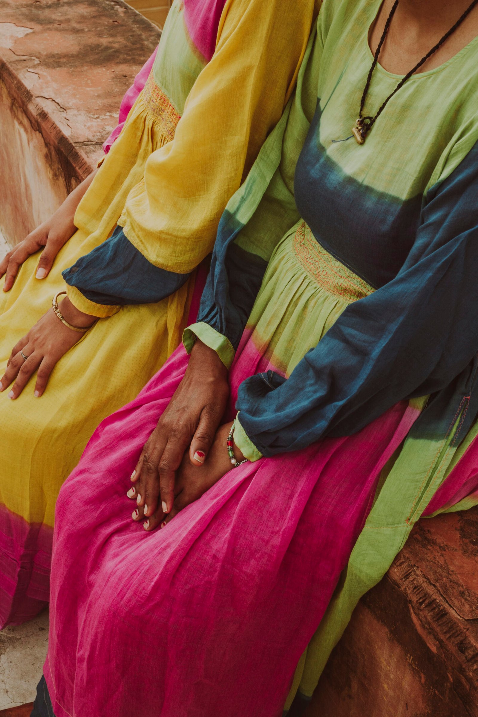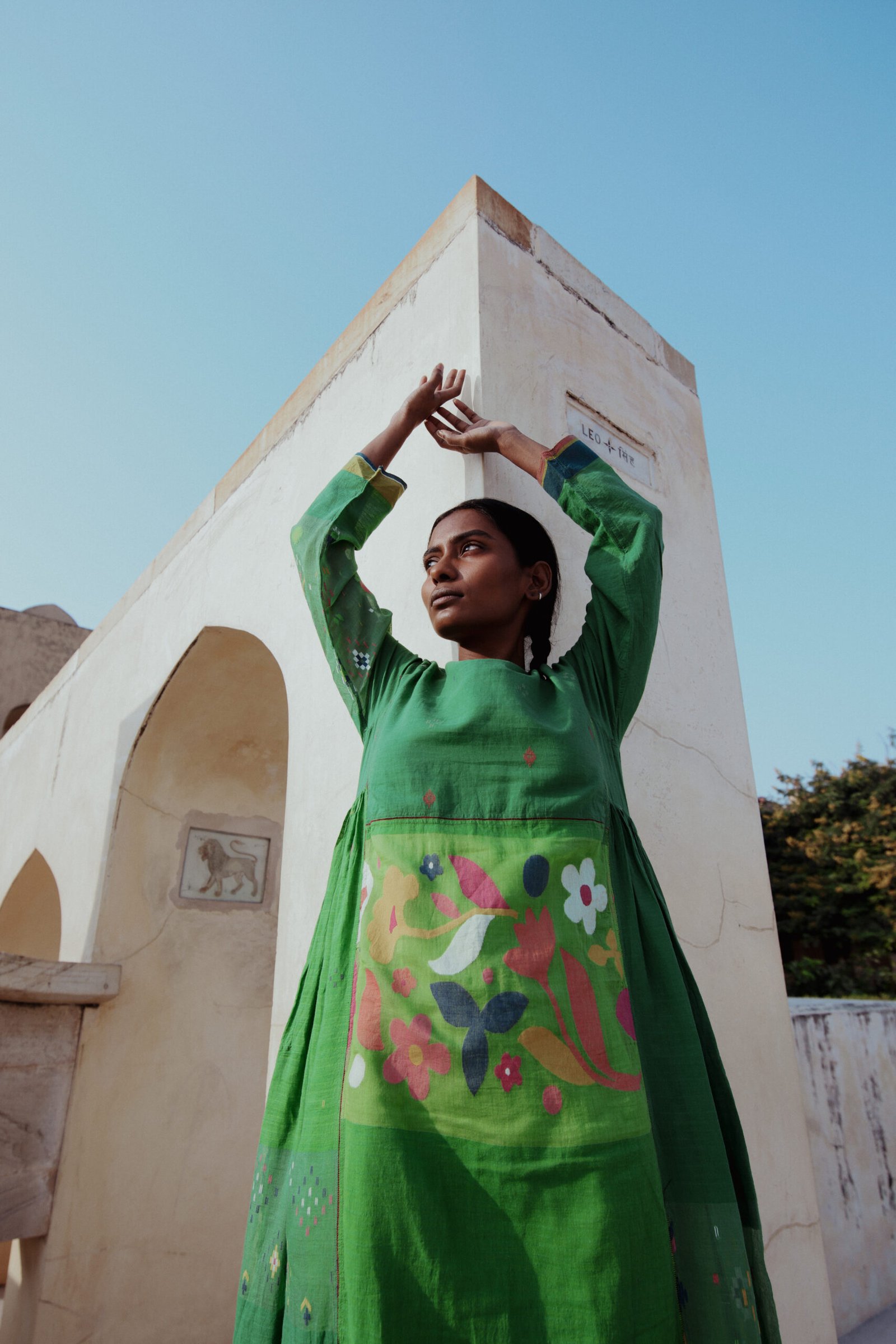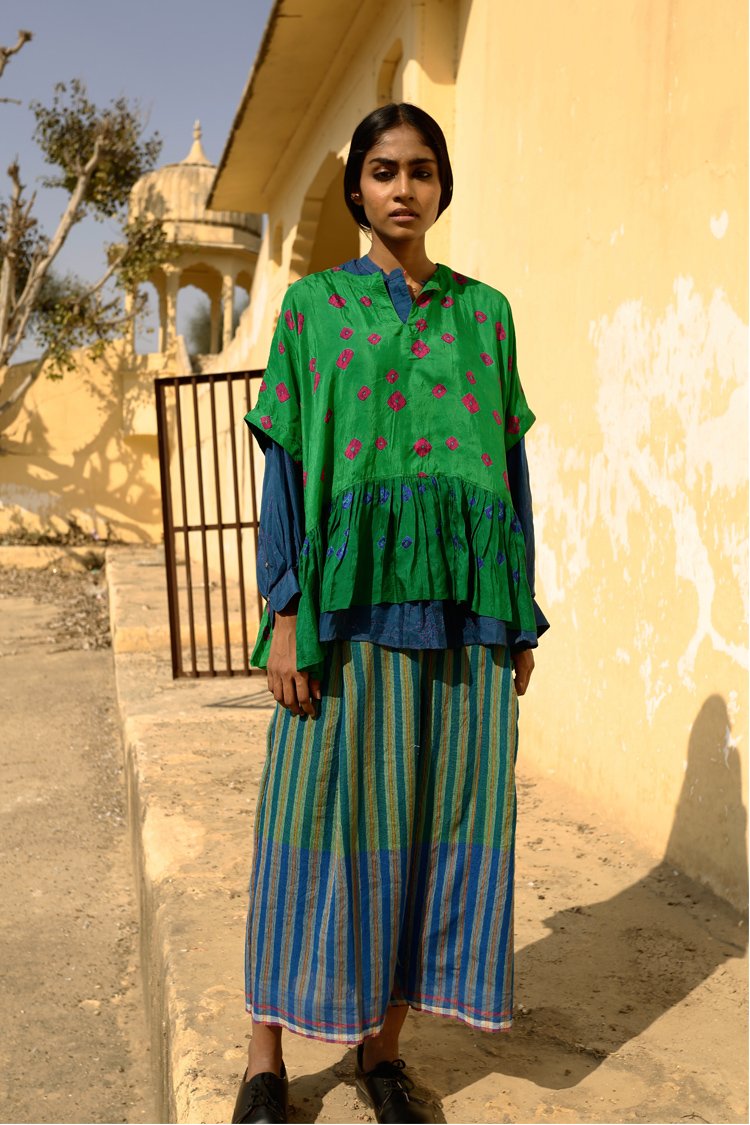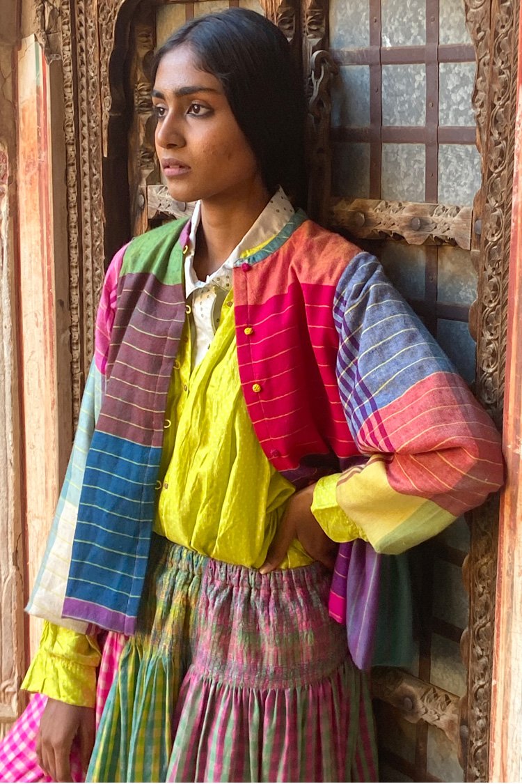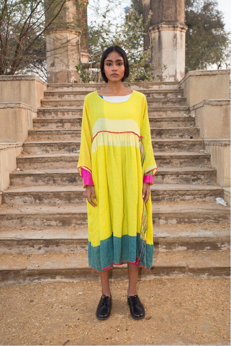 TaanBaan is a celebratory collection embracing Spring and enjoying summer with its gorgeous Greens, Pinks, Yellows, and Whites, created with organic cotton and combining ancient Indian techniques of extra weft from Bhujodi and Jamdani of West Bengal, as well as intensive clamp dying.