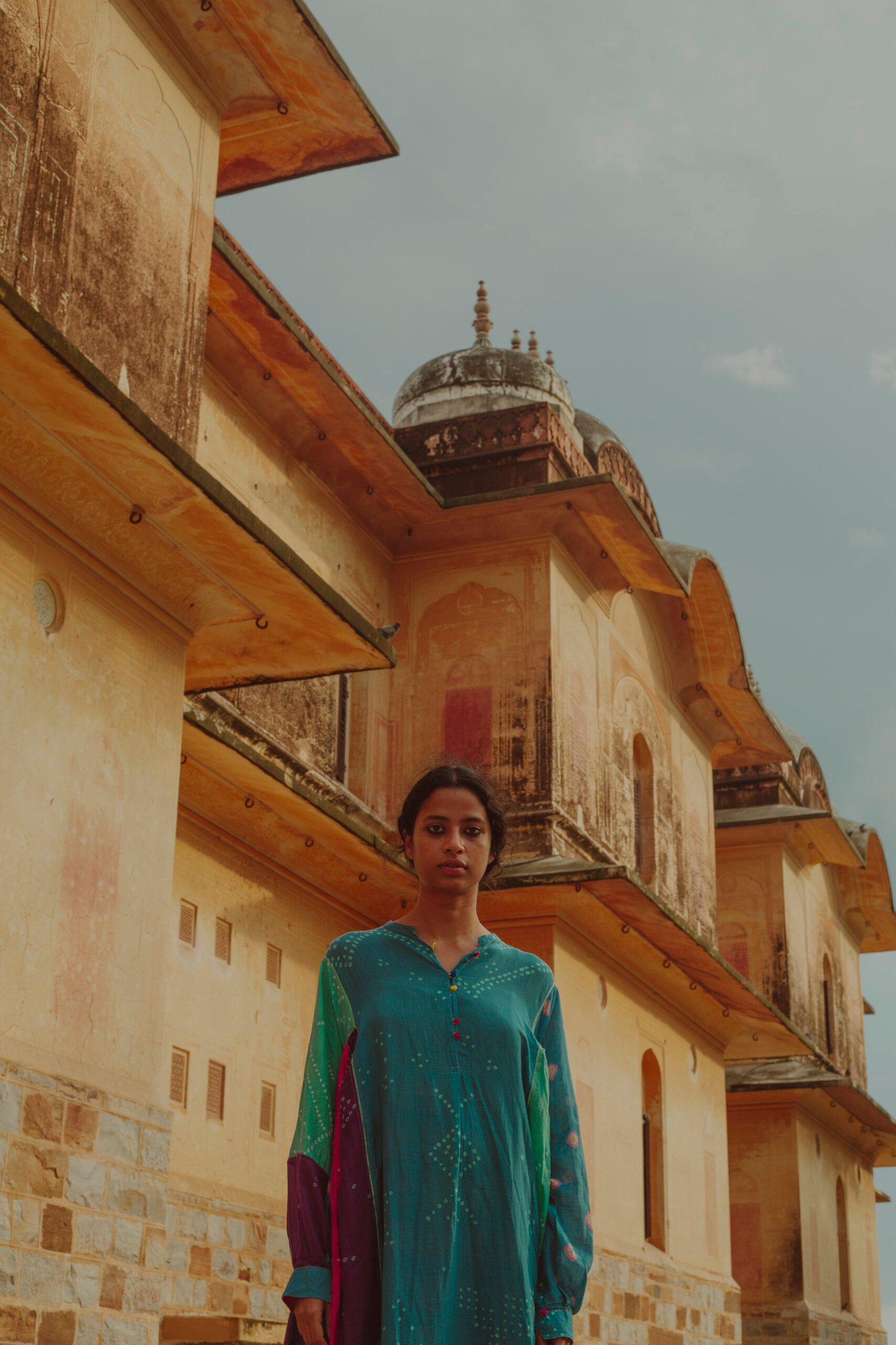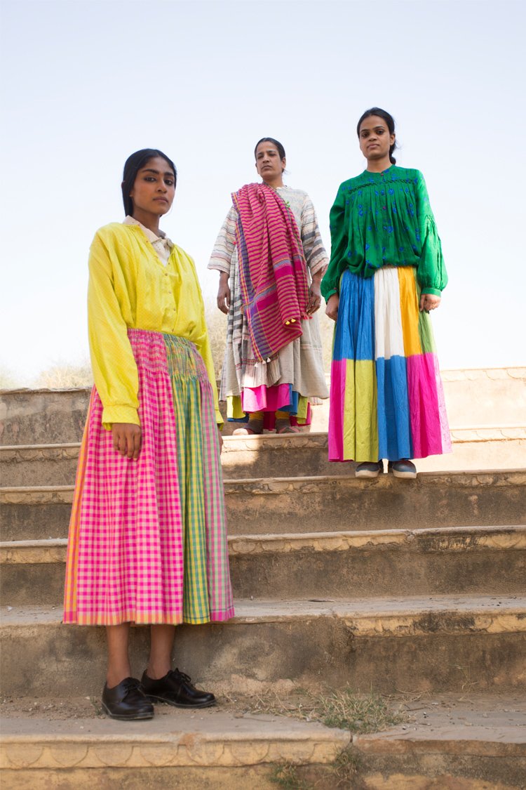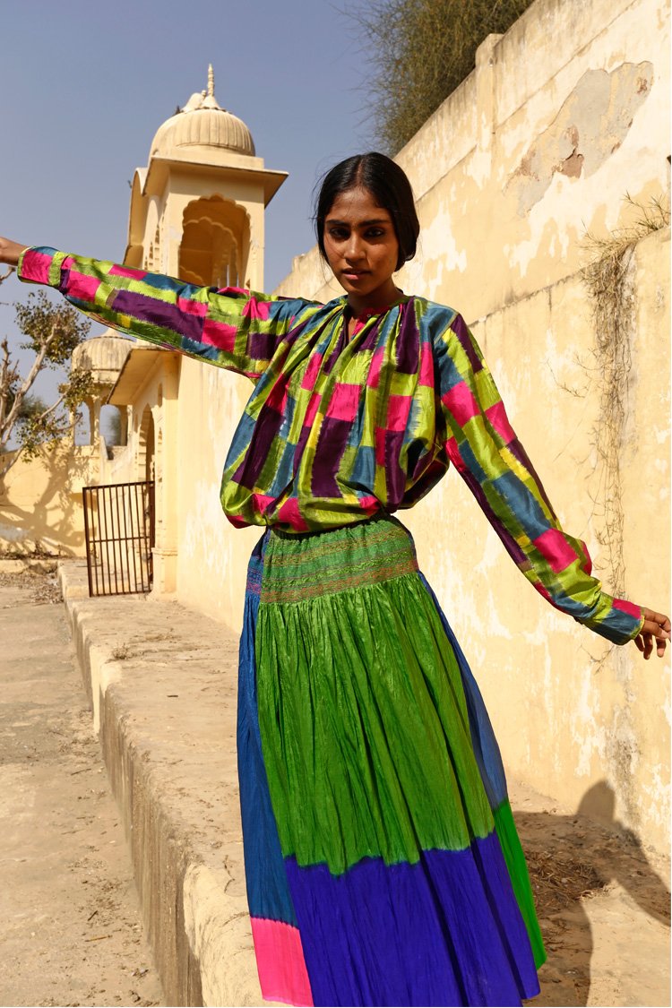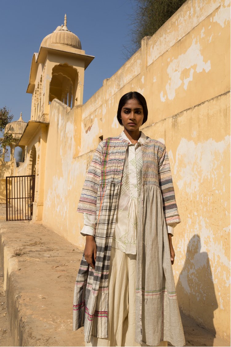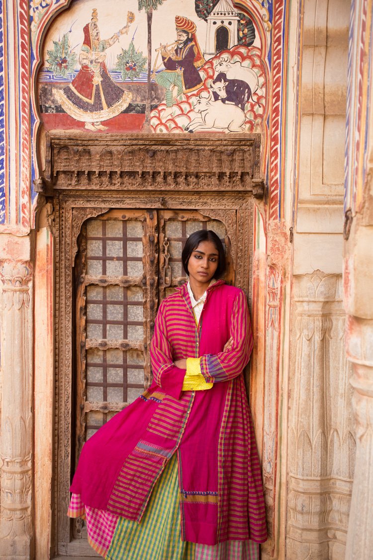 The Fall winter Shekhawati collection is influenced by colours and visual aesthetics of Rajasthan where Chinar has grown up. The name of the collection is called Shekhawati which is an area of Rajasthan with rich cultural heritage. The region is known for it’s beautiful architecture and fresco. The collection is also photographed in this area of exceptional beauty and character. The textiles used are woven in Gujarat and Kashmir. Ikkat or tie resist on yarns before weaving has been introduced for the first time in this collection.